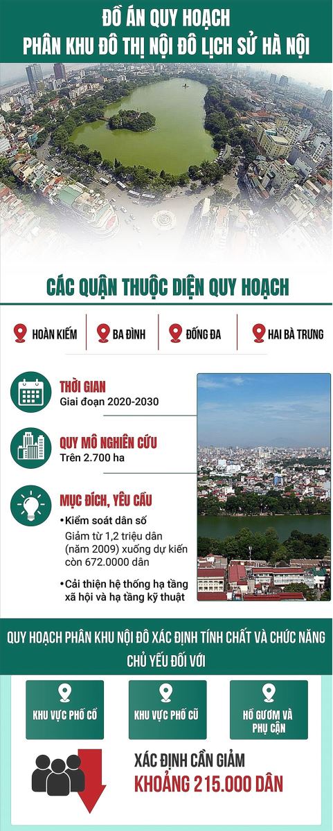 UBND thành phố Hà Nội vừa công bố các đồ án quy hoạch phân khu nội đô lịch sử tại các quận Hoàn Kiếm, Ba Đình, Đống Đa, Hai Bà Trưng. Theo đó, tổng quy mô dân số tại các khu vực khu phố cổ, phố cũ, hồ Gươm và vùng phụ cận cần giảm khoảng 215.000 người trong giai đoạn 2020-2030.
