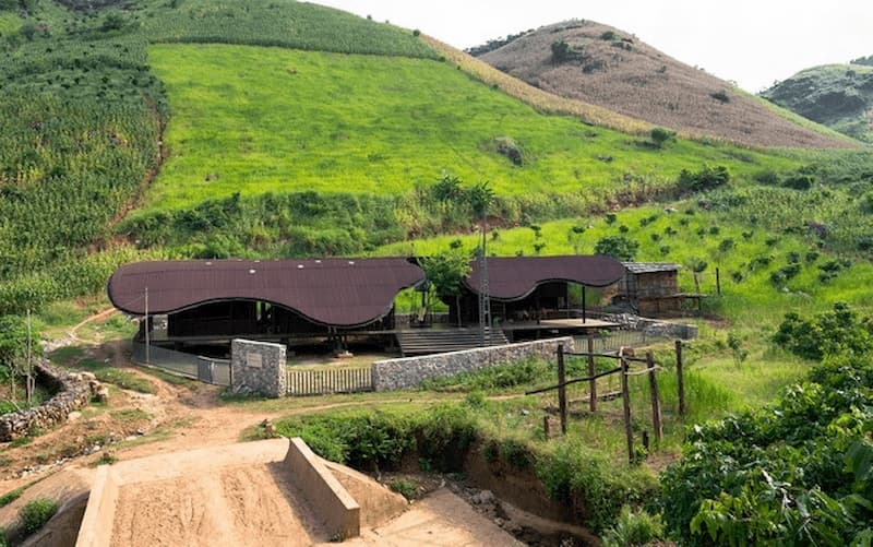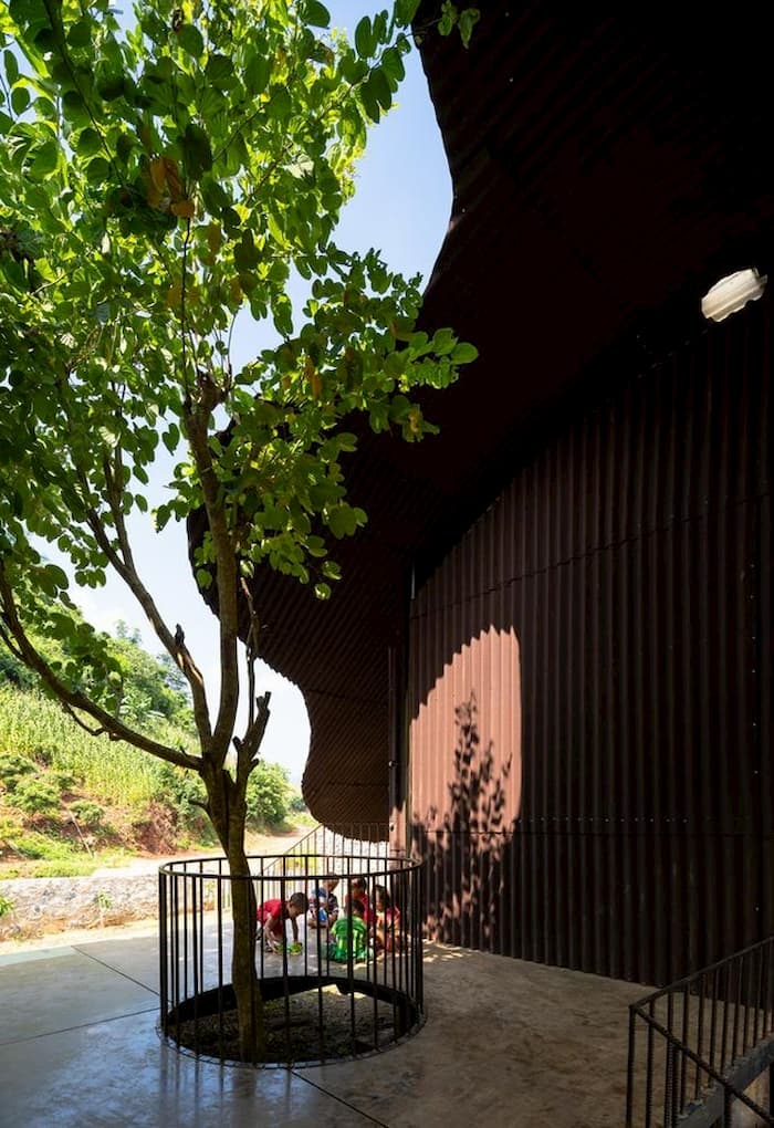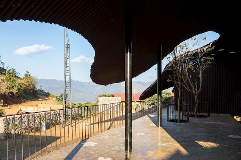 Chính thiết kế độc đáo của phần mái màu nâu có nhiều lỗ nhỏ vừa giúp không gian bên trong luôn ngập tràn ánh sáng mà không cần tác động của ánh đèn điện, vừa tạo điểm nhấn cho ngôi trường trở nên nổi bật giữa nền xanh thẳm của núi đồi, hòa quyện với mây trời và sương khói đặc trưng của miền núi Tây Bắc Việt Nam.